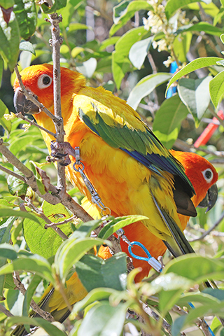 在朋友指引下,得知一個「曬鸚」時機,帶著相機來到螺絲山公園。原來鳥寶寶們個個靚麗,一攀上桂花樹就不停地飛來飛去,鳥主人也用噴水壺給鸚鵡噴水洗浴,而鸚鵡也很享受日光浴時間,除了水浴還用自己的手腳幫助清理身體和羽毛,曬一曬,果然羽毛健康亮麗多了。