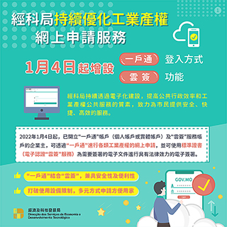 【特訊】為持續推進和優化電子政務,經濟及科技發展局將自二0二二年一月四日起,為現時的工業產權網上申請服務增設「澳門公共服務一戶通」(簡稱「一戶通」)登入方式及電子認證「雲簽」服務功能。