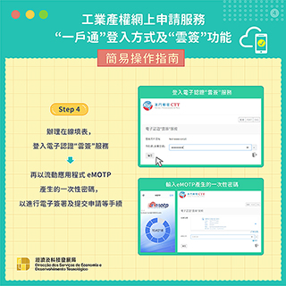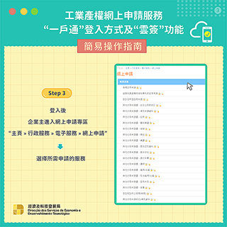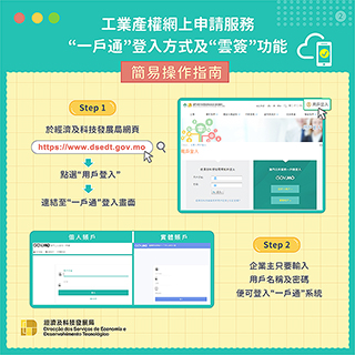 明年一月四日起,已開立「一戶通」帳戶(個人帳戶或實體帳戶)及「雲簽」服務帳戶的企業主,可透過「一戶通」登入該局網頁進行各類工業產權的網上申請,並可使用標準證書(電子認證「雲簽」服務)為需要簽署的電子文件進行具有法律效力的電子簽署。