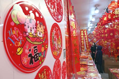 ◎ 一月十一日,河北省石家莊市南三條批發市場,市民選購新春飾品。隨著中國農曆新年的臨近,糖果、乾果、春聯、福字等年貨的銷售行情逐日升溫。(中新社)
