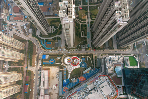 ◎ 一月十一日,航拍武漢市漢陽區漢陽大道萬科未來中心蟲洞公園。截至目前,武漢市累計建成口袋公園約三百五十個。這些口袋公園均利用城市「邊角餘料地塊」和「巴掌地塊」打造,面積最大的二點六萬平方米,最小的僅三百平方米。(無人機照片)(中新社)