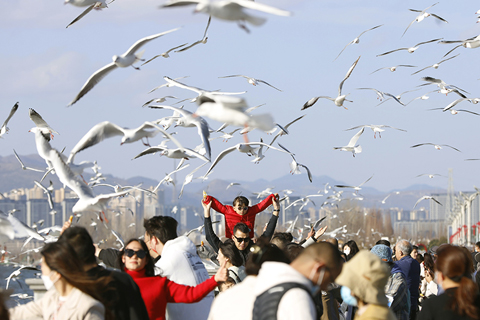 ◎ 一月十一日,民眾在滇池邊觀賞紅嘴鷗。當日,雲南省昆明市天氣晴朗,不少市民和遊客來到滇池與紅嘴鷗共享「春城」冬日暖陽。(中新社)