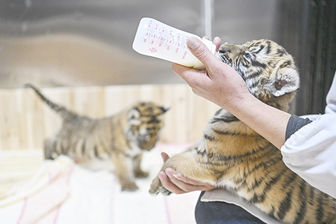 ◎ 一月三十一日,廣東省韶關市,飼養員喂養華南虎幼崽。廣東粵北華南虎省級自然保護區管理處韶關華南虎繁育研究基地的華南虎媽媽「夢夢」於二0二一年十二月三十一日二十三時零二分和二十六分順利產下兩隻華南虎幼崽。目前,兩隻華南虎幼崽情況良好,體重分別為三千六百五十克和三千七百五十克。(中新社記者 陳驥旻攝)