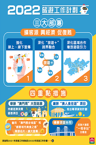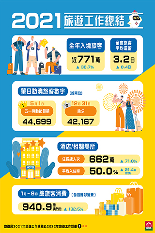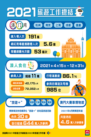 有關旅遊局2021年工作回顧及2022年重點工作,請參考上載於澳門旅遊業界網站的「旅遊局年度工作簡報」,連結:https://industry.macaotourism.gov.mo/file/pdf/2022_Annual_Report.pdf。◇