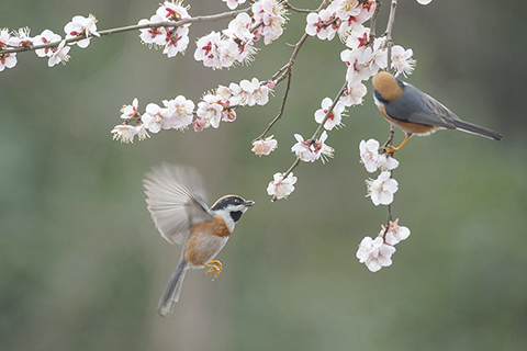 二月四日是二十四節氣中的立春,花兒開放,生機勃勃,引來小鳥「鬧春戲花」。