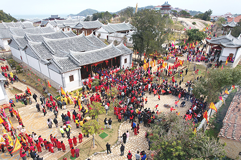 【中新社福建湄洲島二月十日電】(彭莉芳 林春茵)跨海而來的十五位台灣信眾,十日在「媽祖故里」福建省莆田市湄洲島上,一起參加了「媽祖元宵.故里祈福」兩岸信眾護駕湄洲媽祖金身上林故居省親布福活動。