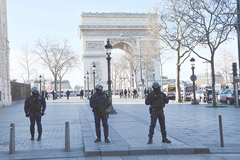 記者當天在凱旋門和香榭麗舍大街看到,警方在這裡戒備森嚴,有數十輛警車、警用裝甲車及拖車部署在此地。眾多警察在香榭麗舍大街的各個路口巡邏,禁止車輛和行人在街上通行。凱旋門所在的戴高樂廣場僅開放了很有限的車道,大部份區域也禁止通行。