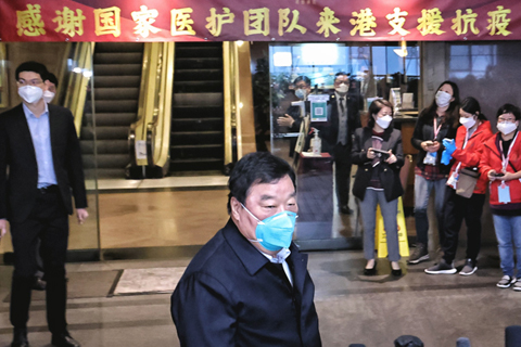 陳冬陪同梁萬年抵達酒店。酒店門前懸掛橫幅,「感謝國家醫護團隊來港支援抗疫」字樣格外醒目。