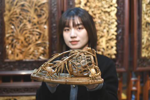 ◎ 二月二十八日,廣東省潮州市,陳嘉展示自己製作的潮州木雕作品《滿載而歸》。「九0後」的陳嘉出生在一個木雕世家,爺爺陳舜羌是潮州木雕代表作「龍蝦蟹簍」的原創者之一。父親陳培希是省級高級工藝美術師。在父親的鼓勵下,陳嘉十四歲起便學習潮州木雕。(中新社記者 陳楚紅攝)