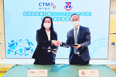 澳門電訊與雷鳴道主教紀念學校二0二二至二0二五年度「培訓及就業計劃合作協議」簽署儀式日前(四日)假澳門電訊高地烏街總店舉行。澳門電訊行政及人力資源總監陳淑嫻和雷鳴道主教紀念學校校長林啟輝分別代表雙方簽署該合作協議。根據合作協議內容,澳門電訊將繼續為雷鳴道主教紀念學校職業高中課程的學生,提供專業培訓、參訪考察及通訊知識講授等內容;當中高三學生將於澳門電訊導師的督導下,進行為期三十四周的專業實習培訓,並完成由澳門電訊與雷鳴道主教紀念學校共同設計的畢業項目;同時,成功修畢該課程之學生,澳門電訊將提供優先聘用機會。