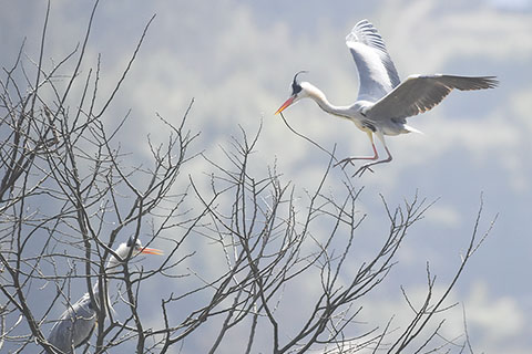 ◎ 三月七日,在貴州省貴陽市開陽縣禾豐鄉黨寨村,蒼鷺忙著啣樹枝築巢。新華社發(喬啟明 攝)