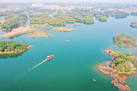 ◎ 三月八日,在重慶市大足區雙龍湖景區,一艘遊船泛舟湖上(無人機照片)。(新華社記者唐奕 攝)