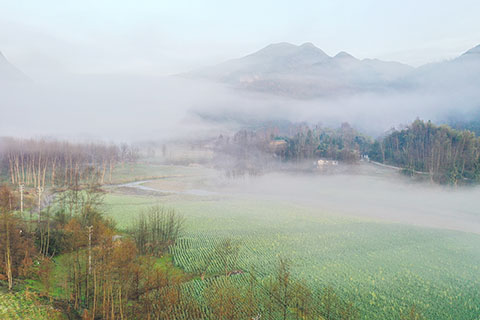 ◎ 三月八日,早春時節的湖南省湘西土家族苗族自治州龍山縣召市鎮前衛村晨霧繚繞,油菜花待放,美景如畫(無人機照片)。新華社發(曾祥輝 攝)