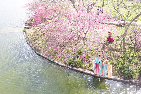 ◎ 三月七日,遊人在廣西賀州市平桂區沙田鎮賞花留影(無人機照片)。新華社發(廖祖平 攝)