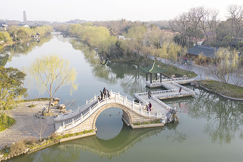 ◎ 三月八日,遊客在江蘇揚州瘦西湖風景區踏春遊湖(無人機照片)。新華社發(齊立廣 攝)
