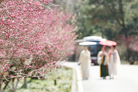 ◎ 三月八日,遊人在湖南省張家界景區黃石寨梅園遊玩。新華社發(吳勇兵 攝)