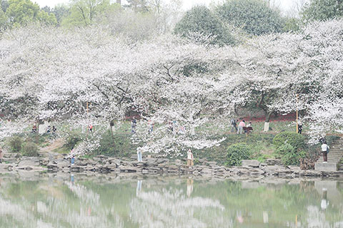 ◎ 三月十八日,湖南長沙,湖南省植物園櫻花盛開,猶如「春雪」覆蓋在園內湖畔四周,吸引遊人前來觀賞美景。(中新社記者 唐小晴攝)