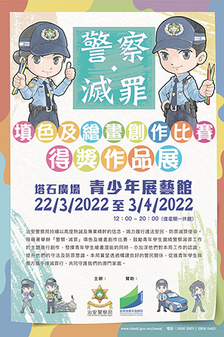 【特訊】治安警察局持續以高度熱誠及專業精幹的信念,竭力履行護法安民、防罪滅罪使命。現藉著舉辦「警察‧滅罪」填色及繪畫創作比賽,鼓勵青少年學生圍繞警察滅罪工作的主題進行創作,發揮青少年學生繪畫潛能的同時,亦加深他們對本局工作的認識,提升他們的守法及防罪意識,是次填色及繪畫創作比賽共徵集得約一千四百份來自澳門中、小學的參賽作品。