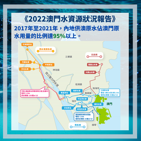 供水安全方面,第四條對澳供水管道、平崗-廣昌原水保障工程、大藤峽水利樞紐左岸工程、石排灣水廠等項目於過去五年內相繼落成,使澳門的供水安全得到前所未有的保障。過去五年,澳門自來水出廠水質一直保持在優質綠色低鹹度級別。《二0二二澳門水資源狀況報告》的電子版可於局方網頁瀏覽。
