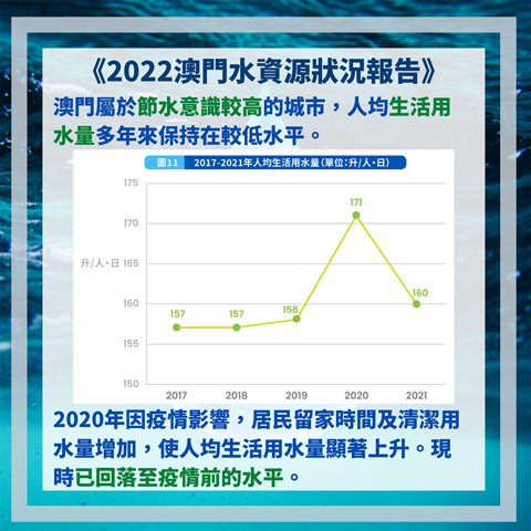為推廣今(二十二)日世界水日,海事局昨日公佈《二0二二澳門水資源狀況報告》,涵蓋了二0一七至二0二一年的水資源數據和資料。截至二0二一年,澳門自來水用戶總數已超過二十五萬戶,其中超過百分之七十九用水戶位於澳門半島。用水量方面,本澳人均生活用水量多年來基本保持在較低水平,顯示澳門屬於節水意識較高的城市,僅二0二0年由於疫情關係,生活用水量因居民居家時間以及防疫清潔用水增加而明顯上升,而二0二一年已回落至每人每日一百六十升,和疫情前的水平相若。