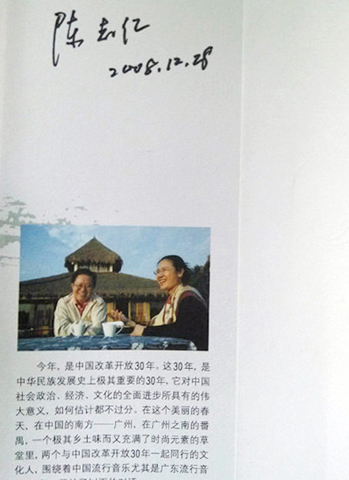 2008年12月28日,陳志紅與著名音樂人陳小奇合著的《中國流行音樂與公民文化——草堂對話》一書,在廣州購書中心大堂簽售,當時我還拿著她的簽名書與她合影,那是她上任南方日報出版社社長不久。
