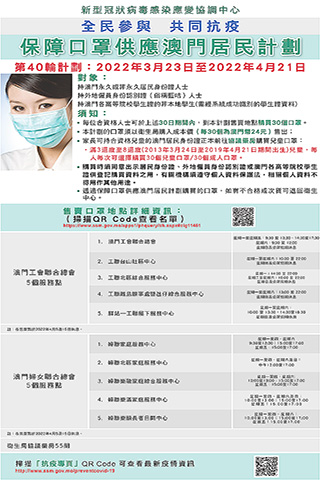 【特訊】新型冠狀病毒感染應變協調中心昨日公佈,第四十輪保障口罩供應澳門居民計劃於今日開始,售賣期間為三十日,即二0二二年三月二十三日至二0二二年四月二十一日,期間每人可一次性購買三十個口罩,售價合共二十四澳門元。衛生局協議藥房、本澳兩個社團(工聯、婦聯)繼續提供售賣口罩服務。即全澳共有六十五個售賣點,服務時間詳見附圖。透過口罩計劃購買的口罩,如有不合格或次貨可退回衛生中心。
