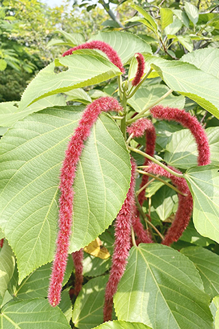 紅穗鐵莧菜為大戟科、鐵莧菜屬植物,原產自太平洋島嶼;灌木,嫩枝被灰色短絨毛、後逐漸脫離,長成小枝即無毛。葉呈紙質、邊緣具粗鋸齒,為卵圓形。