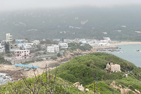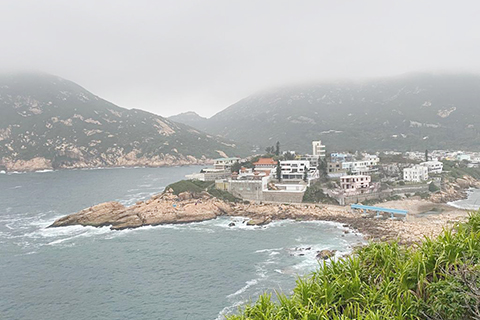 上到山頂的仿古瞭望亭,是三百六十度的景觀,可以看到茫茫大海中更為澎湃的海浪,回望則是石澳半島全景,走出瞭望亭,稍為走近懸崖邊,地勢險要,令人驚心動魄,俯瞰海崖氣勢磅礡,大有蘇軾「赤壁懷古」中的氣勢(大頭洲的石也是赤紅色)──「大江東去,浪淘盡……亂石穿空,驚濤拍岸,捲起千堆雪。」◇