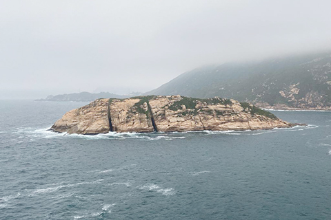 再走前,可以近距離看到一座猶如郵輪的小島「五分洲」,海浪不斷拍擊五分洲,形成一條白邊圍繞島嶼,煞是好看。