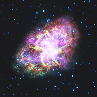在十八世紀著名的梅西葉「非彗星」星表裡,蟹狀星雲的編號是M1。我們現在知道蟹狀星雲實際上是個超新星遺跡,是一顆大質量恆星在西元一零五四年發生死亡爆炸後,所留下來的擴張碎片雲。這幅全新的二十一世紀蟹狀星雲影像,整合了橫跨數個電磁波段之影像數據,並以不同色澤的可見光加以顯示。其中攝於太空的錢德拉(X射線)、XMM-Newton(紫外光)、哈伯(可見光)、和史匹哲(紅外光)數據,分別以紫、藍、綠、及黃色來呈現。來自地面的極大陣列的電波數據,則以紅色來呈現。影像中心的亮斑即為蟹狀星雲波霎,它是顆每秒自轉三十次的中子星,也是現代天文學家所知最奇特的天體之一。就如同一部宇宙級的發電機,這個恆星核驅動星雲在所有電磁波段發出輻射。跨幅約為十二光年的蟹狀星雲,位在金牛座內,離我們只有六千五百光年遠。◇