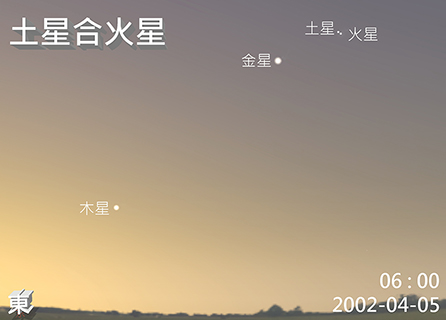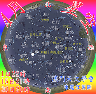 水星外合:4月3日7點。火星合土星:4月5日6點,火星在土星以北0.32度。木星合海王星:4月13日4點,木星在海王星以南0.11度。水星合天王星:4月18日22點,水星在天王星以南2.14度。金星合海王星:4月28日3點,金星在水星以北0.01度。水星東大距:4月29日16點,(20.6°)0.2等。◇ (建燁)