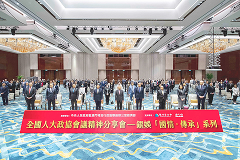 【特訊】銀河娛樂集團(下稱「銀娛」)多年來積極推動團隊成員深入認識國家概況、發展趨勢及機遇,以增進其對國情的了解。隨著十三屆全國人民代表大會五次會議及中國人民政治協商會議十三屆全國委員會五次會議(下稱「兩會」)在三月中於北京圓滿閉幕,由中央人民政府駐澳門特別行政區聯絡辦公室(下稱「中聯辦」)經濟部指導、澳門基金會及《澳門日報》支持、銀娛主辦的「全國人大政協會議精神分享會─銀娛『國情‧傳承』系列」(下稱「分享會」)於本月廿五日舉行。是次分享會邀請到中聯辦經濟部處長孫耀華出席;並邀請到全國人大代表、《澳門日報》社長陸波;全國政協委員、澳門基金會行政委員會主席吳志良;以及全國政協委員、銀娛副主席呂耀東就今年「兩會」,傳達意義深遠的「兩會」精神,並分享相關情況及個人體會。