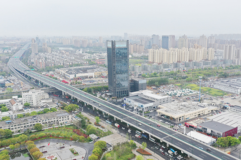 ◎ 三月三十日,車輛行駛于紹興城北的于越智慧快速路。近日,杭州二0二二年亞運會重點配套工程──浙江紹興于越智慧快速路通車。該道路全長20.9公里,實施「應用建築信息模型、結構健康監測、智慧交通、車路協同、智慧照明」五大數字化智慧系統,是中國首條支持高級別自動駕駛的路網級智慧快速路。(無人機照片)(中新社記者 王剛 攝)