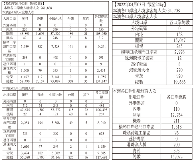 【特訊】新型冠狀病毒感染應變協調中心昨日宣佈,因應內地的疫情變化,衛生局根據第2/2004號法律《傳染病防治法》第10條和第14條的規定,自2022年4月4日凌晨1時起,所有曾經到過以下地點的入境及已入境人士,須按照衛生當局的要求在指定地點接受醫學觀察至離開當地後14天但最短不少於7天:黑龍江省佳木斯市湯原縣陽光河畔小區、學府新城10號樓、清華新城5、12號樓、幸福家園3、4、8號樓;遼寧省大連市金普新區馬橋子街道凱悅公寓B座;湖南省衡陽市衡東縣石灘鄉石金村小泉屋組。