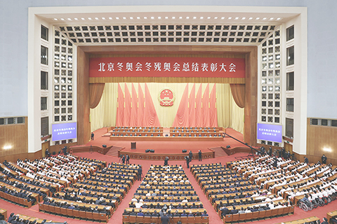 人民大會堂大禮堂,氣氛莊重熱烈。主席台上方懸掛著「北京冬奧會冬殘奧會總結表彰大會」會標,後幕正中是熠熠生輝的中華人民共和國國徽,10面紅旗分列兩側。二樓眺台懸掛標語:「緊密團結在以習近平同志為核心的黨中央周圍,大力弘揚北京冬奧精神,為全面建設社會主義現代化國家、實現中華民族偉大復興的中國夢而團結奮鬥!」