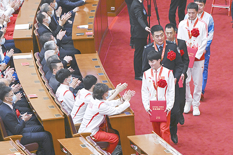 韓正宣讀《中共中央、國務院關於表彰北京冬奧會、冬殘奧會突出貢獻集體和突出貢獻個人的決定》。決定指出,為隆重表彰先進典型,激勵全黨全國各族人民為全面建設社會主義現代化國家而努力奮鬥,黨中央、國務院決定,授予國家速滑館場館運行團隊等148個集體「北京冬奧會、冬殘奧會突出貢獻集體」稱號;授予蘇翊鳴等147名同志、追授鄧小嵐同志「北京冬奧會、冬殘奧會突出貢獻個人」稱號。