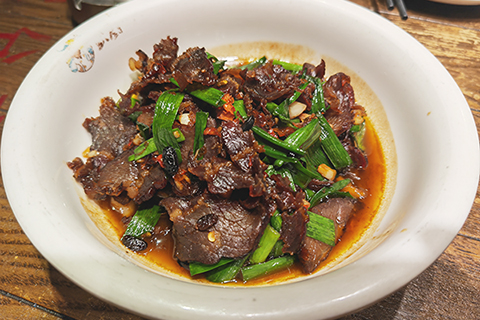 拗不過甯鄉兄弟的盛情邀請,從長沙坐輕軌到長沙代管的縣城甯鄉泡溫泉,在他的帶領下我們品嘗寧鄉美食臘牛肉,像極了內蒙古風乾牛肉,肥肉色如蜜蠟,瘦肉深紅如血,這是高脂肪密度和高血紅蛋白的典型特徵。辣椒羊肉排,辣椒嗜香續辣越吃越上癮。羊肉似乎經歷油炸的洗禮,血水完全脫乾,肉質纖維變得脆而蓬鬆,脂肪中的油脂大部分已經滲出,纖維口感似蜜餞,瘦肉鬆中帶脆。最愛地瓜葉,湖南紅土地種的葉子更加綿軟香甜,回味無窮。