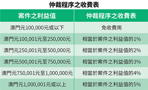 【特訊】「澳門消費爭議調解及仲裁中心」(下稱「中心」)訂定收費規則及收費表。「中心」為十萬澳門元或以下的消費爭議提供免費服務,超過十萬澳門元案件將按經濟利益值計算調解或仲裁費用。