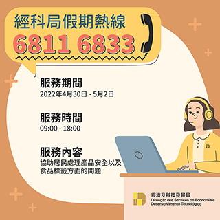 「長幼愛.共融」系列活動啟動禮舉行 推廣長幼共融社區精神 工人醫療所與社工局合辦醫療講座 聚焦濫用處方藥物使用者及社會支援 「開心帶你遊澳門」 介紹青少年愛國愛澳教育基地 「琴澳心橋.藝暖人生」文藝匯演舉行 琴澳殘疾人共演美好畫卷 司警到三校防罪宣教 配合三十多場文化活動 秋季書香文化節一連十日舉行 房屋局辦「家居防火安全」講座 首兩場約兩百社屋長者出席 澳門會展業獲國際高度認可 解析前沿趨勢掌握先機 新一期《澳門消費》出版 全部樣本檢測報告均符澳標準 勞工局宣導巡查雙管齊下優化勞資關係 勞資糾紛個案同比降二成二 「小畫筆·大英雄」親子創意畫大賽頒獎 廿組親子獲大獎百組獲優異獎 「澳門文化遺產·速寫行」舉行 匯聚全球畫筆助力文旅融合發展 全面提升社會各界對金融犯罪防範意識 金情辦開展多項推廣及教育工作 下月一至五日在澳舉行 第五十屆葡萄牙旅行社協會年會 粵劇曲藝總會辦「喳篤撐同樂日」 冀以新穎方式吸引年輕觀眾 海事局巡漁船及碼頭 宣導防火安全知識 服務青年公僕,貢獻澳門社會 公總青委會理監事換屆 鏡湖醫院舉辦糖尿病防治專題講座 推動「糖肝共管」一站式服務 「天沐杯」橫琴名校賽艇邀請賽 廿五支國內外高校競技 珠海市舉辦社會工作專業領域實地培訓 推動專業服務提質增效 疑遭「公檢法」電話詐騙 一男大生損失九萬多元 將持續與當局合辦社區防火宣傳活動 工聯冀加強「職安健」培訓 旅遊局多管齊下 築牢業界防火安全防線 澳門物管商會呼籲業界 全面檢視防火安全 就澳琴規劃銜接、政務互通等問題 黃少澤在橫琴調研 十六浦娛樂場完成關場工作 澳科大舉行頒授典禮 五人獲授榮譽院士 就空巴A三二0型系列飛機軟件更新 民航局已指示澳航跟進 預測今日有幾陣微雨 經科局設服務熱線 2022-04-29 03:30:00 【特訊】經濟及科技發展局從明天起的公眾假日期間(四月三十日至五月二日)設立服務熱線六八一一六八三三,協助居民處理產品安全以及食品標籤方面的問題。若居民對產品安全存有疑問、或發現商戶刪改食品標籤、售賣過期食品等情況,可於上述期間的上午九時至下午六時致電服務熱線,經科局將派員跟進處理。◇