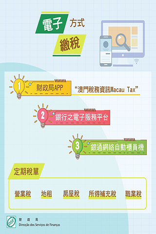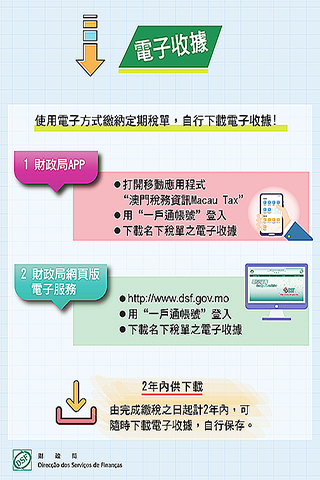納稅人於稅單指定繳納月份內以電子方式繳納營業稅、地租、房屋稅、所得補充稅及職業稅定期稅單後,可以從財政局移動應用程式「澳門稅務資訊MacauTax」或網頁版「電子服務」平台,直接下載其名下已繳稅單的電子收據。