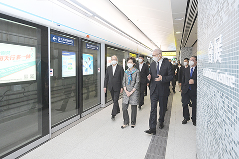 林鄭月娥在運輸及房屋局局長陳帆、港鐵公司主席歐陽伯權、行政總裁金澤培陪同下視察會展站月台及大堂,並聽取港鐵公司代表介紹站內的設施和特色。