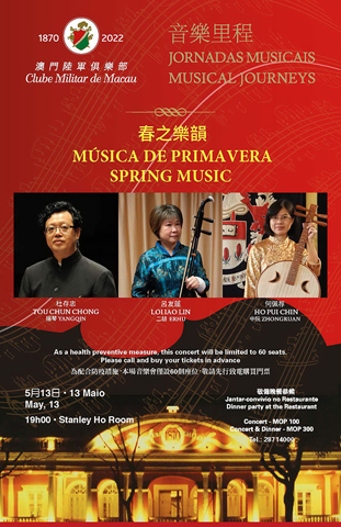 【特訊】澳門陸軍俱樂部活動「音樂里程」,將於五月十三日,星期五,下午七時在何鴻燊博士廳舉行。音樂會主題為《春之樂韻》,演出者為杜存忠(揚琴),呂友蓮(二胡),何佩薦(中阮)。