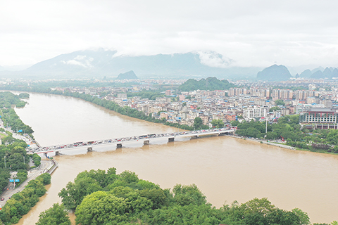 廣西桂林市漓江桂林水文站出現今年入汛以來最高洪峰 2022-05-11 03:30:00 ◎ 受連續強降雨和上游來水影響,五月十日十七時,廣西桂林市漓江桂林水文站出現今年入汛以來最高洪峰,洪峰水位一百四十五點八九米,距警戒水位一百四十六米還有零點一一米,流量二千二百六十立方米每秒,為常遇洪水。圖為航拍漓江虞山橋段。(無人機照片)(中新社發 楊宗盛攝)