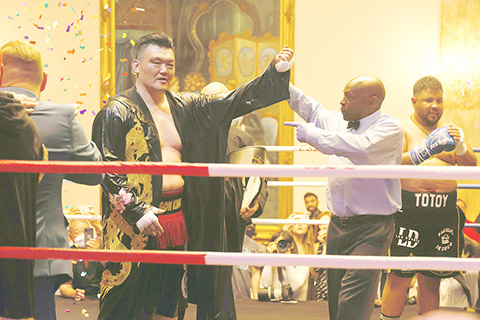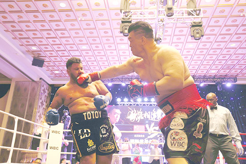 ◎當地時間五月十四日晚,有「亞洲拳王」之稱的張君龍(正面左)在加拿大安大略省列治文山舉行的加拿大職業拳擊理事會國際重量級金腰帶爭霸賽中,戰滿十個回合,憑藉點數擊敗墨西哥拳手吉列爾莫.卡薩斯(Guillermo Casas),以一場勝利宣示其在國際拳台上沉寂近四年後的復出,同時也保持了其在職業拳擊賽中的不敗戰績。這是張君龍移居加拿大後展開的系列重量級賽事的首場比賽,也是首次有亞裔拳手參加加拿大重量級職業拳擊賽。(中新社記者 余瑞冬 攝)