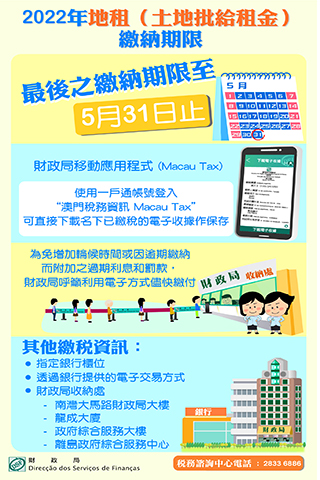 【特訊】二0二二年地租(土地批給租金)最後之繳納期限至五月卅一日止,為免增加排隊輪候時間或因逾期繳納而附加之過期利息和罰款,財政局呼籲倘仍未繳納上述地租者儘快繳付。