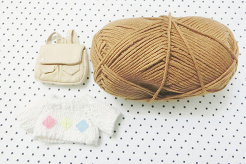 (3)紅色、黑色、杏色、棕啡色、深藍色線圈各一個,手針一支,剪刀一把,珠針一盒,鉛筆一枝,棉花少許,膠水一支,棕啡色冷線一卷,長袖冷衫一件,杏色背包一個。