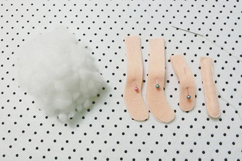 (二)用珠針將兩塊腳部布和兩塊手部布重疊並固定好位置,再以鎖針的方法縫合及塞滿棉花。