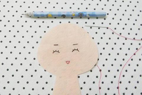 (三)在一塊頭部布的布面上,用筆畫上眼睛、眼眉、嘴巴及繡出形狀。