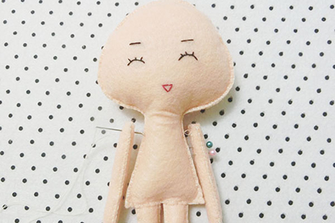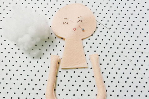 (四)用珠針將兩塊頭部布重疊並固定好,再以鎖針的方法縫合,並在適合的位置套入腳部及塞滿棉花。