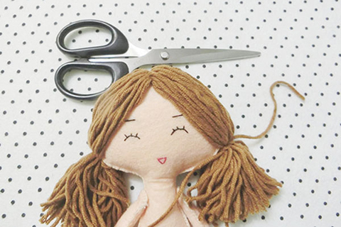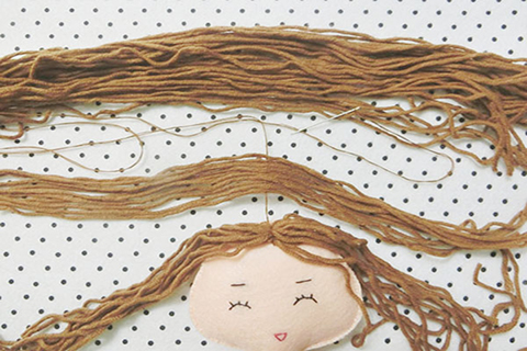 (七)將縫好的頭髮梳理好,用膠水將頭髮與頭部布面黏合及裁剪成合適的長度。